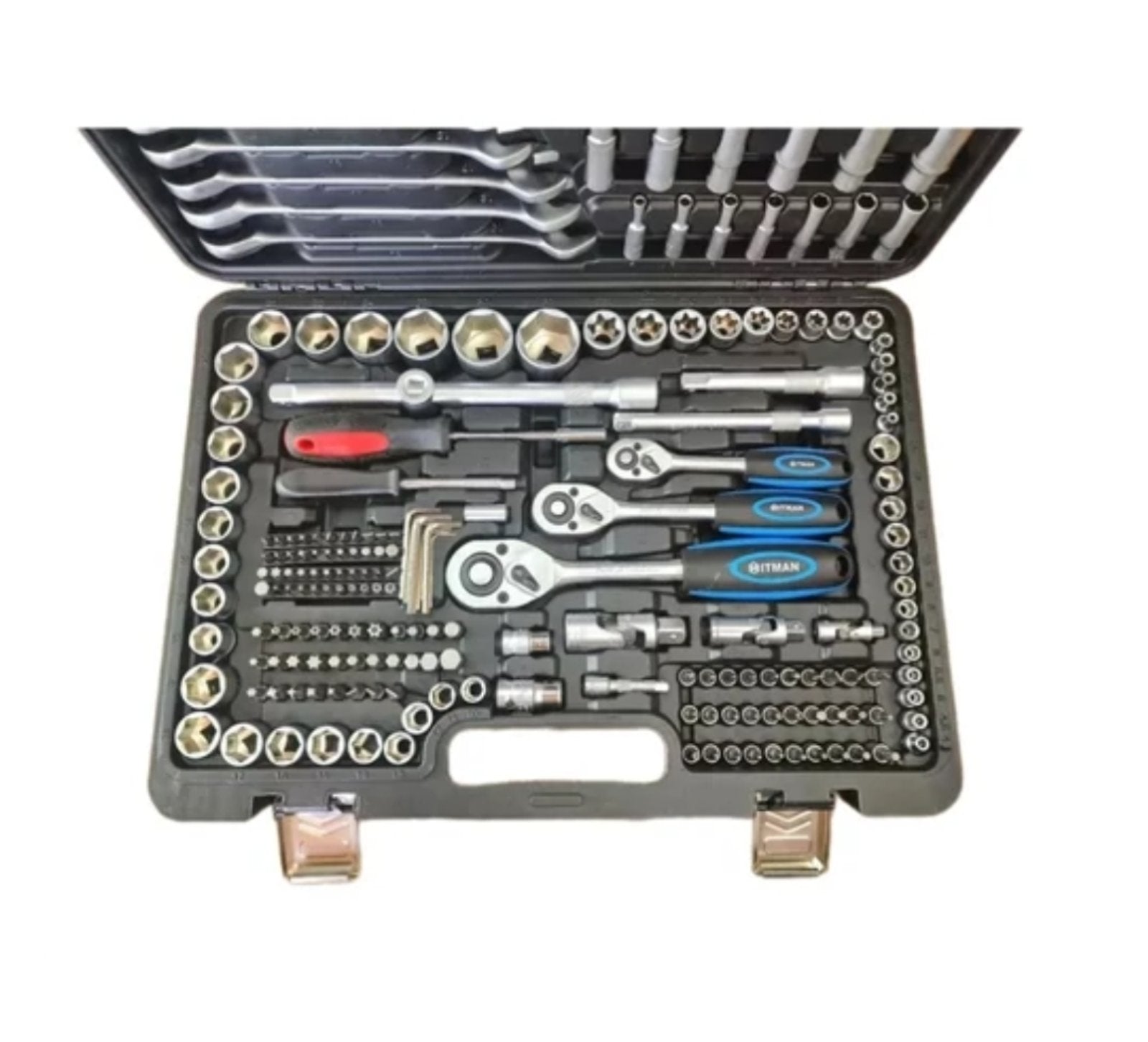 Sadrži kompletan izbor nasadnih ključeva, nastavaka, bitova i racni, izrađenih od kvalitetnog hrom-vanadijum čelika (Cr-V) koji obezbeđuje dugotrajnost, otpornost na habanje i savršeno prijanjanje.